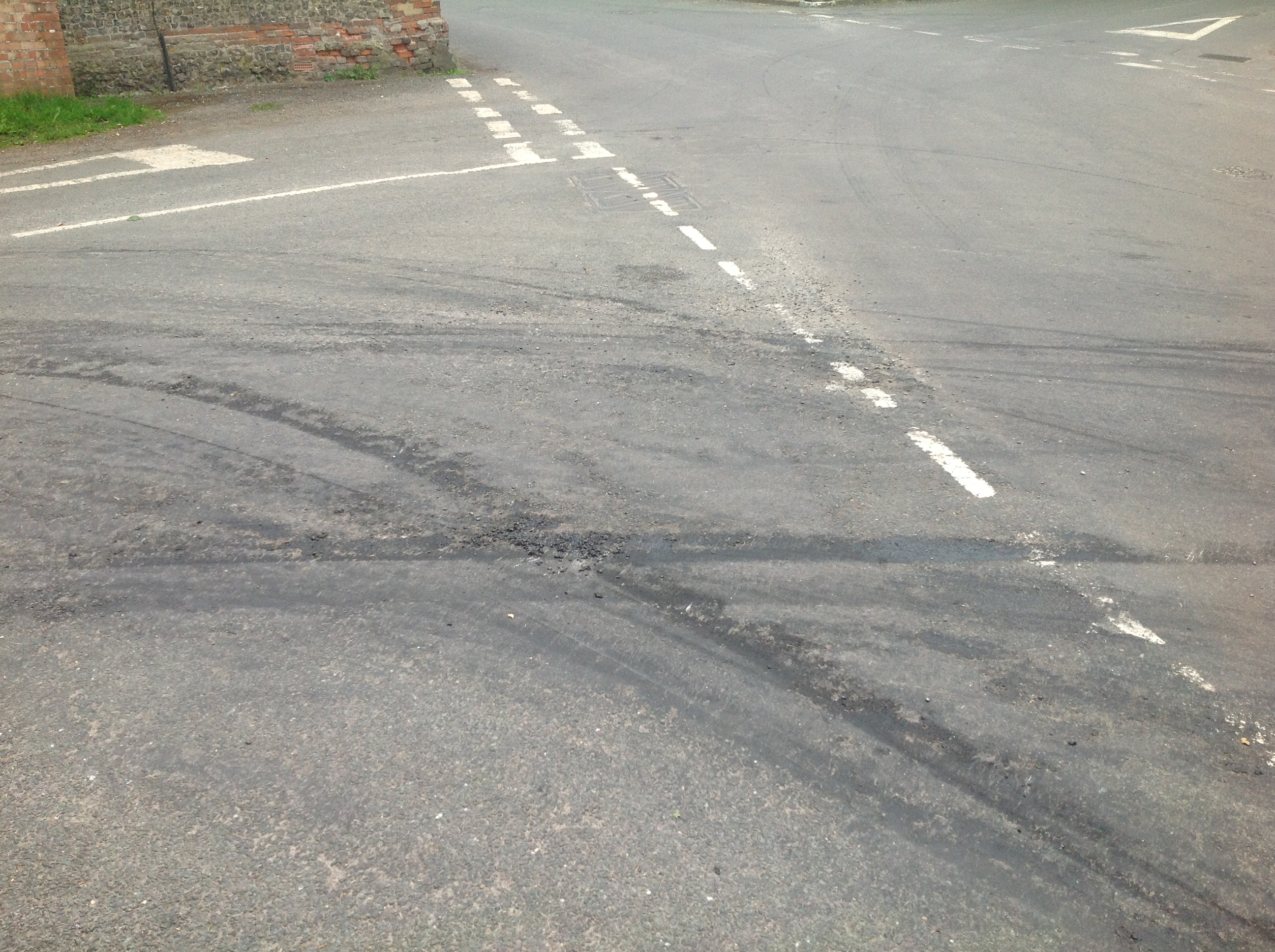 It should be noted that the marks on the road are not just the rubber, but the tarmac is actually being ripped up.