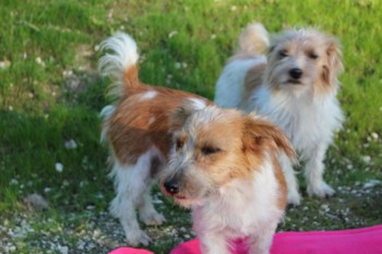 Two Sporting Lucas terriers (basically a Jack Russell and Norfolk cross) white with light tan marking, mother and daughter, Dolly and Tinker. They both ran from our house to go hunting in the nearby wood and refused to come back. They may have gone to ground, although they never have previously, they have only dug, without tunnelling.
