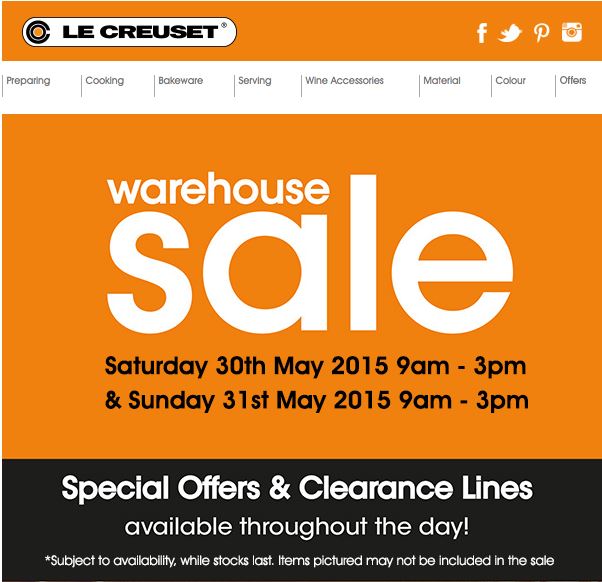 Le Creuset Warehouse Sale: 30 & 31 May May12 by Monxton Matters Share this: Click to share on Facebook (Opens in new window) Facebook Click to share on X (Opens in new window) X Click to email a link to a friend (Opens in new window) Email Like Loading... Related