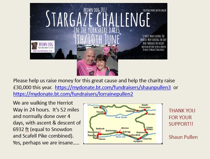 This weekend, 9-10 June, Shaun and Lorraine Pullen will complete the 2017 Brown Dog Challenge, raising money for the diagnosis and treatment of cancer. This is a walk of 52 miles in 24 hours, through the night, with a climb and descent greater than Snowdon and Scafell Pike combined, and involves completing the Herriot Way in Yorkshire – normally done over a 4 day period. This is a tough challenge for a great cause. If you would like to support them please go to: