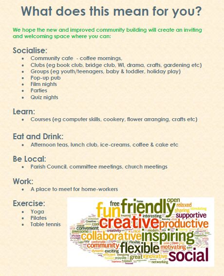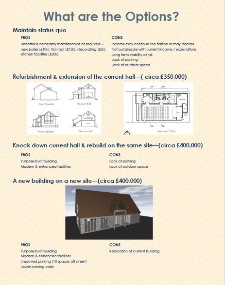 Three years ago we canvassed villagers as to what you might want from a village hall.   The outcome of this was planning permission to renovate the current hall (16/01869/FULLN).  To finance this, you have supported fundraising events and our project fund stands around £35,000.  Build costs for this renovation are estimated to be in the region of £350,000 with eligible grant funding around £200,000-250,000 and the hall would be closed for 4-6 months during renovations.  Another option might be to build a new, purpose-built hall on the current site.