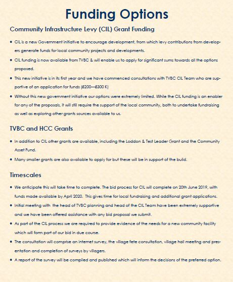 This main fund is called CIL (Community Infrastructure Levy) which was introduced in 2016. Currently, TVBC is holding CIL funds of approximately £1.2m and we are confident that our bid stands a very good chance of success. More information on CIL can be found here: https://www.testvalley.gov.uk/planning-and-building/cil/bidding-for-cil-funds