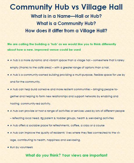 Some villagers have commented that the application is somewhat confusing in that it mentions a village hub while also talking about a village pub. This confusion appears to be a conflation with a previous plan, which was supported by the Parish Council for a new village hall (aka Hub) on the Black Swan car park with this plan to build a new pub and change the current Black Swan building to a residential property.