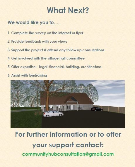 There will be an open evening on Tuesday 25th February from 7.30pm to 9pm in the village hall. The architect, Luke Rose, will be in attendance to answer any questions, along with the Parish Council and Village Hall Committee. Please come along to find out more!