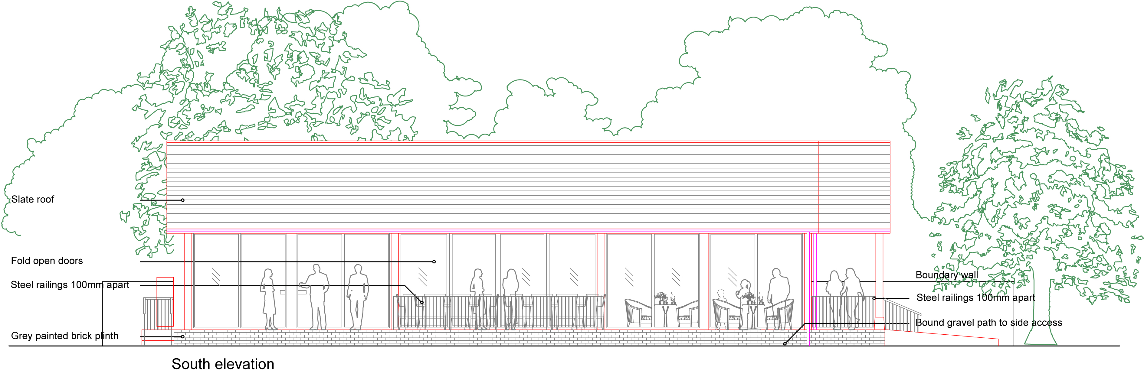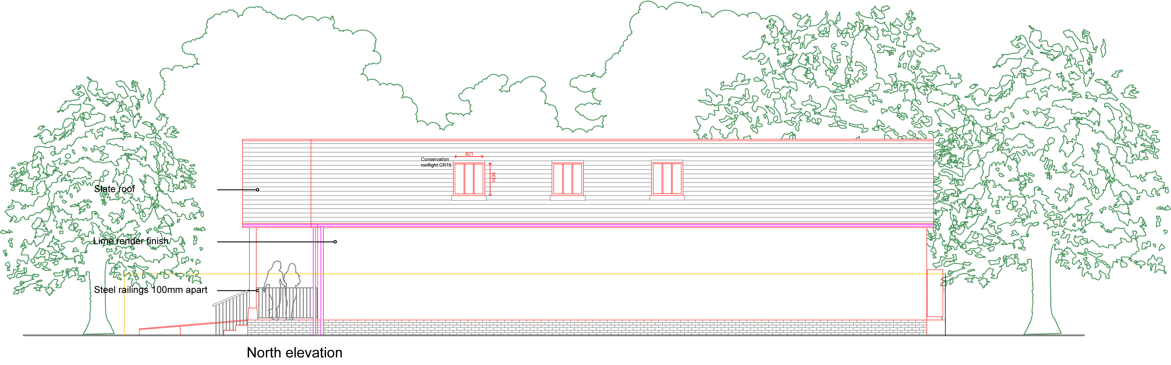 East Elevation – from the road. The yellow line shows the outline of the existing building.